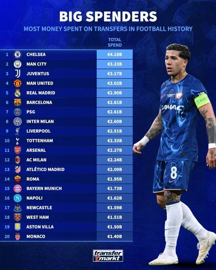 直播吧7月29日讯 《转会市场》统计了历史转会费支出情况,切尔西独自领跑,前11名中英超独占6席。